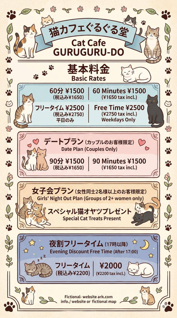 基本料金 | 60分 猫おやつ付き ¥1500(税込¥1650) | |